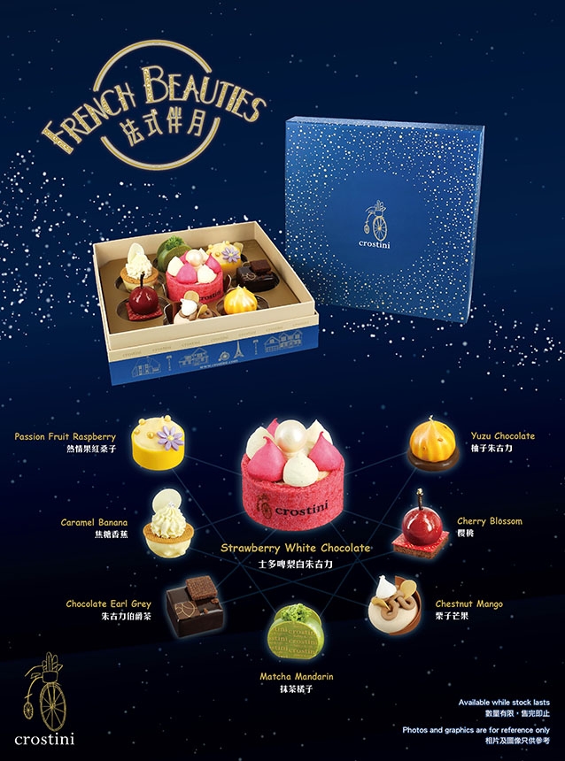 Crostini 隆重推出『法式伴月』禮盒,八款與別不同嘅精緻小蛋糕,配以高貴簡約嘅禮盒,為您呈獻典雅嘅月圓甜點盛宴!