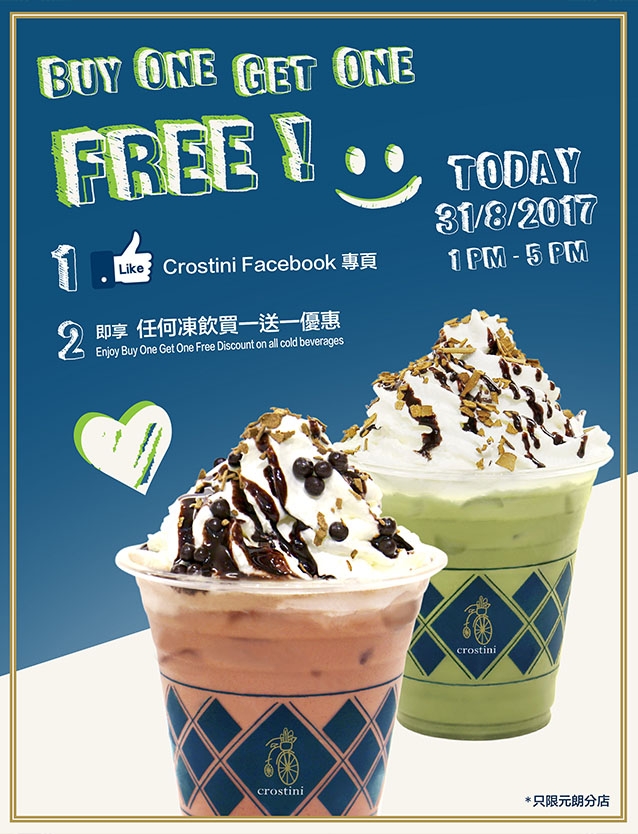 今日下午1點至5點元朗YOHO Mal II 分店所有凍飲買一送一呀喂!帶埋你既閨蜜、同事一齊黎嘆返杯啦!