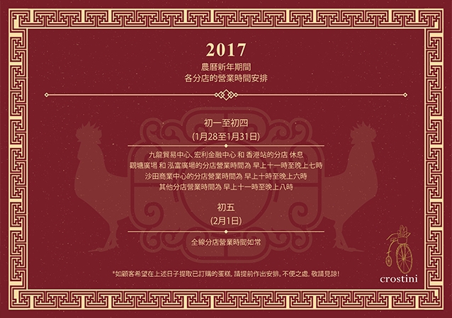 Crostini 分店於農曆新年期間的營業時間將有所特別安排,部份分店更會照常營業!