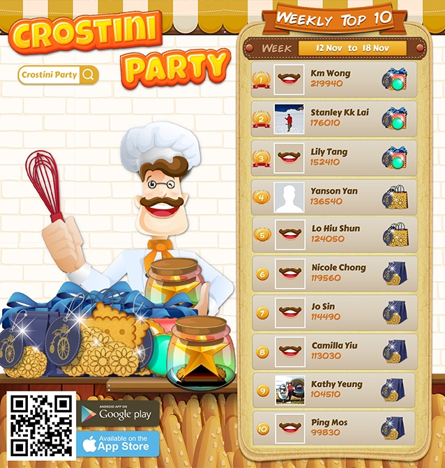 恭喜10位得獎者!想免費食到Crostini蛋糕同埋曲奇就快D下載Crostini Party,玩遊戲贏大獎啦!