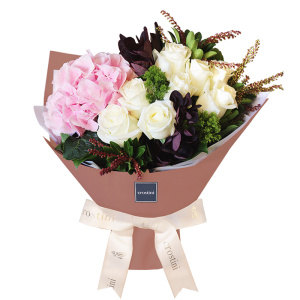 花:粉紅繡球花,白玫瑰 及其他襯花 處理鮮花束注意事項: