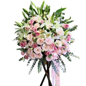 花:粉色桔梗,白色百合,Ohea 玫瑰及其他襯花.